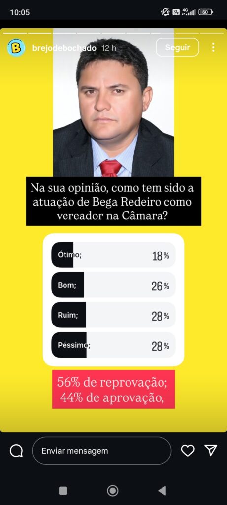 Outro vereador que se destaca no quesito reprovação é Bega Redeiro (PP). No levantamento online, o parlamentar tem 56% de reprovação e 44% aprovam seu trabalho.