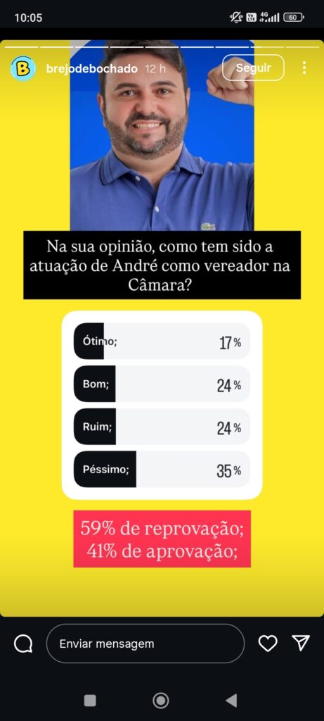 O vereador André Filgueiras (PP), tem seu mandato reprovado por 59% da população de Brejo do Cruz. Enquanto 41% aprovam sua atuação parlamentar.