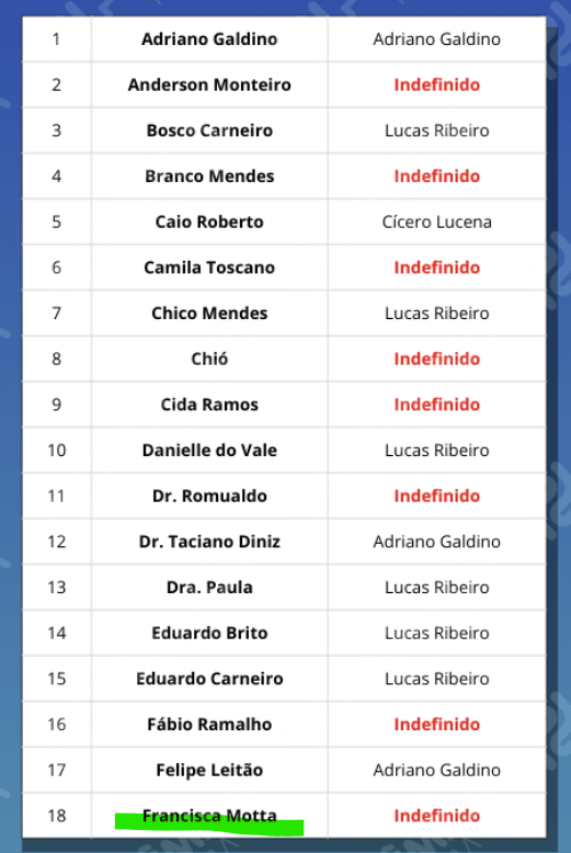 Entre as respostas, chamou atenção a declaração de Francisca Motta, que disse estar “indefinida”.