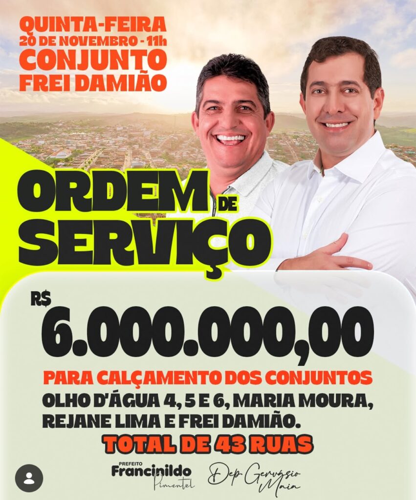 As ações serão uma das maiores intervenções de pavimentação da cidade e contemplará as regiões de Olho d’Água 4, 5 e 6, Maria Moura, Rejane Lima e Frei Damião.