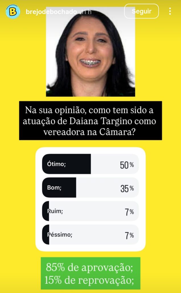 O trabalho da vereadora Daiana Targino (PSDB), no seu primeiro mandato como vereadora é aprovado por 85% da população de Brejo do Cruz.