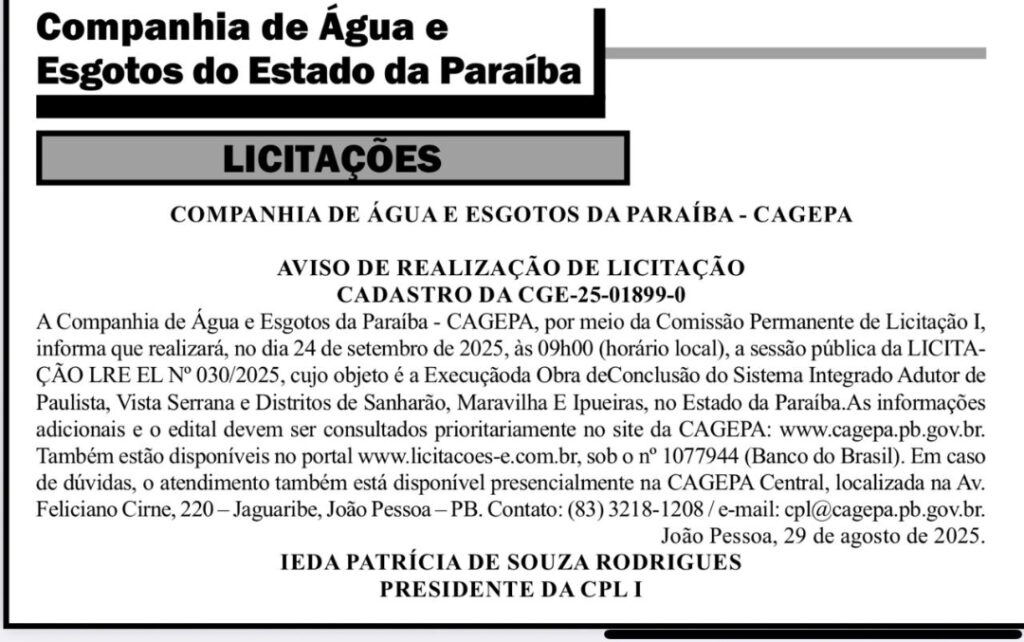 De acordo com o Governo da Paraíba através da Cagepa, a licitação será realizada no próximo dia 24 de setembro, às 9 horas da manhã.