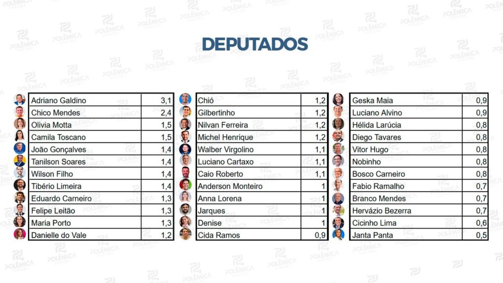 Os líderes da pesquisa são o atual Presidente da Assembleia, Adriano Galdino, seguido de perto por Chico Mendes, com a estreante Olívia Motta fechando o pódio.