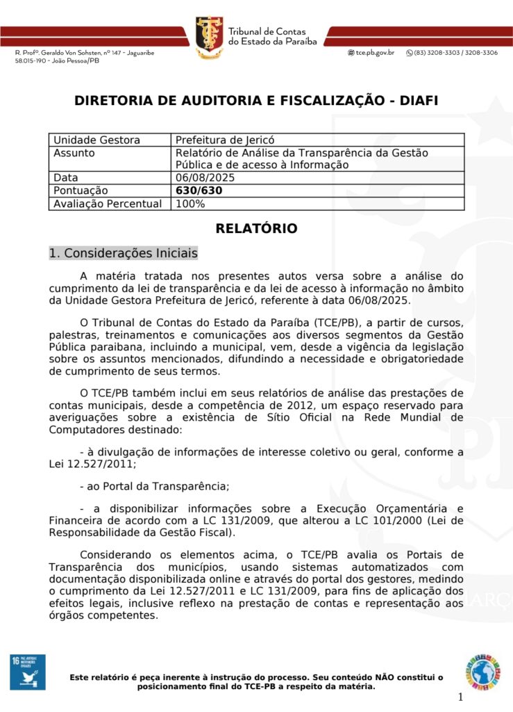 A Prefeitura de Jericó atingiu o índice de 100% em transparência pública, conquistando o Selo Ouro do programa Turmalina do Tribunal de Contas do Estado da Paraíba TCE-PB.