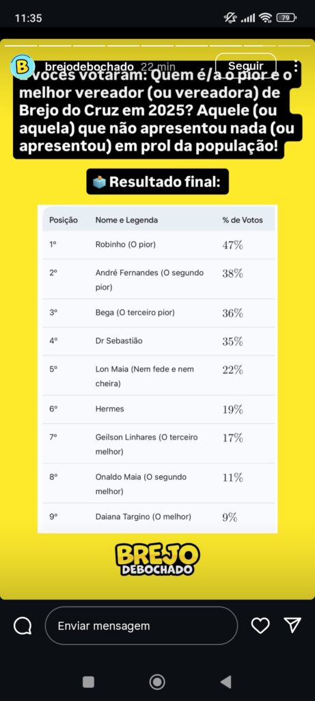 O vereador Robinho de Braz (PSDB), foi eleito o pior parlamentar do município de Brejo do Cruz em uma enquete realizada pela página de Instagram Brejo Debochado.