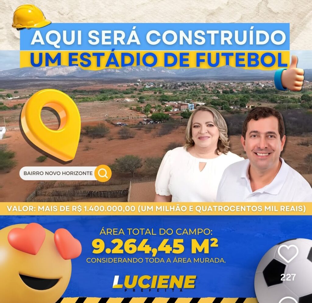 O estádio será construido no Bairro Novo Horizonte. A prefeita Luciene comemora a conquista história do esporte local.