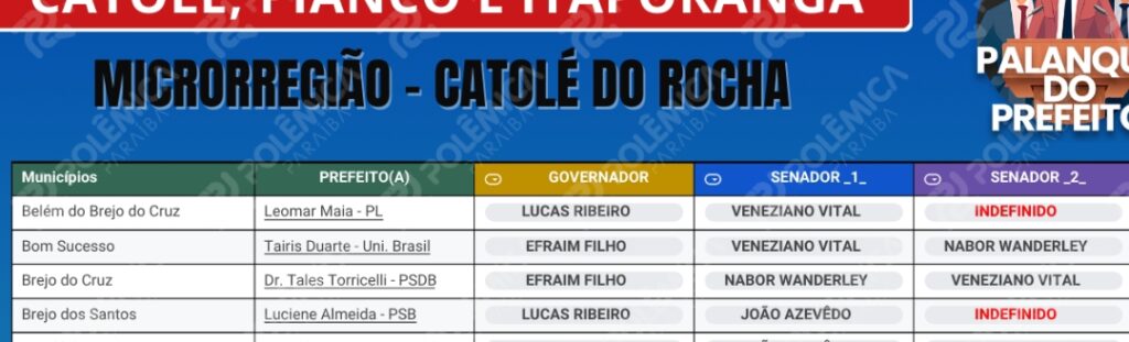 Os prefeitos Dr. Tales Torricelli (PSDB) de Brejo do Cruz e Tairis Duarte (UP) de Bom Sucesso, declararam seus respectivos votos para Efraim Filho ao governo da Paraíba nas eleições 2026.