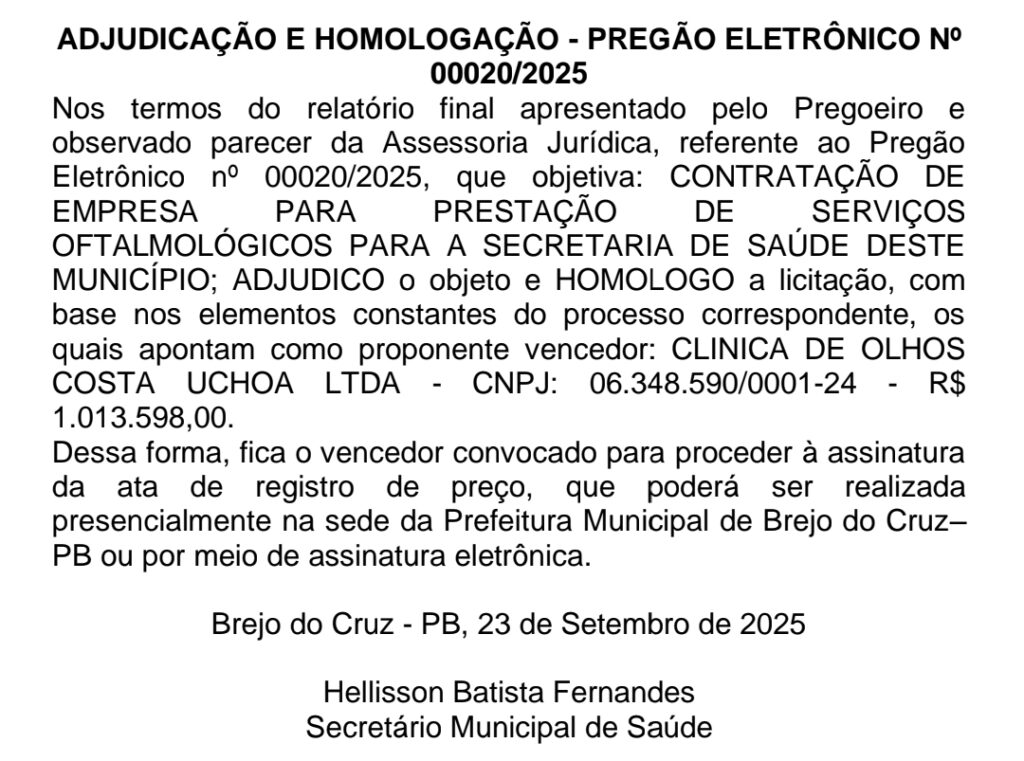 Prefeitura de Brejo do Cruz fecha contrato em serviços oftalmológicos por mais de R$ 1 milhão