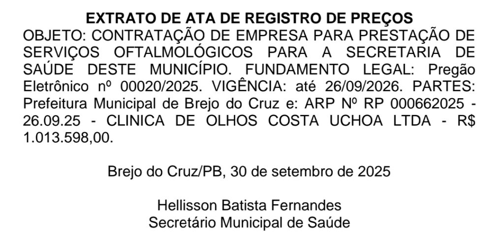 A Prefeitura de Brejo do Cruz, comandada pelo prefeito Dr. Tales Torricelli (PSDB), publicou o extrato de contratação de uma empresa para prestação de serviços oftalmológicos para a Secretaria Municipal de Saúde.