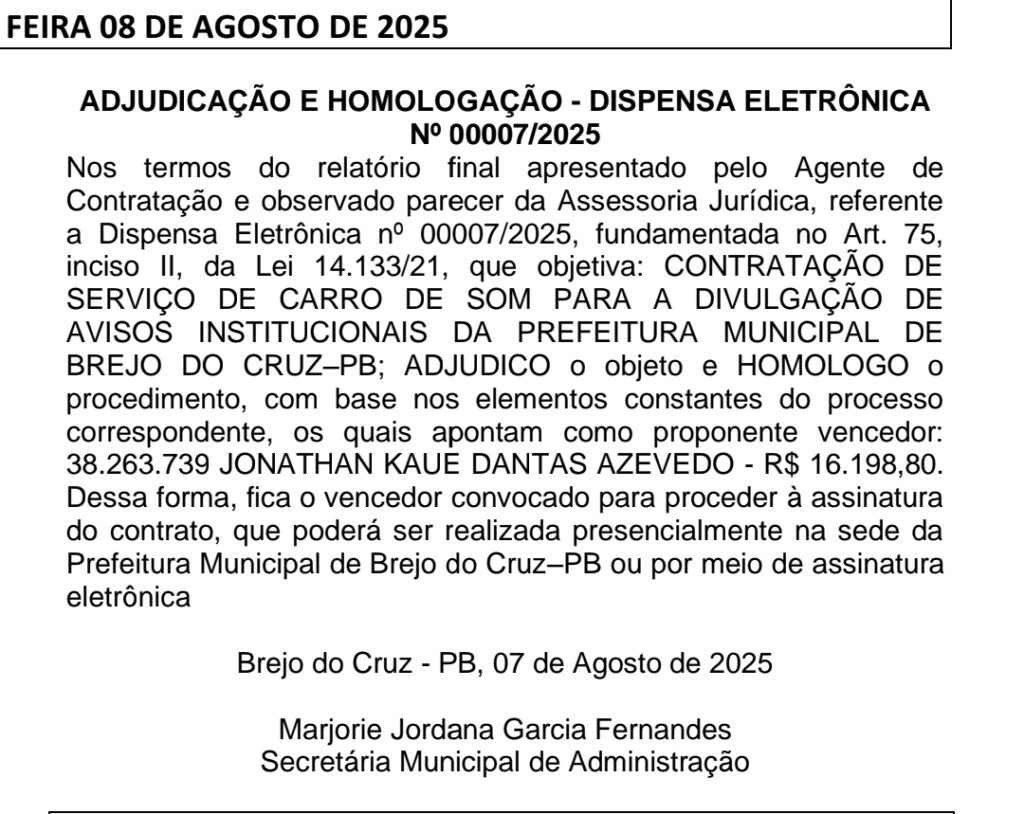 A Prefeitura de Brejo do Cruz pretende gastar um pouco mais de R$ 16 mil reais com a contratação de serviços de publicidade volante (carro de som), para avisos institucionais da gestão municipal.