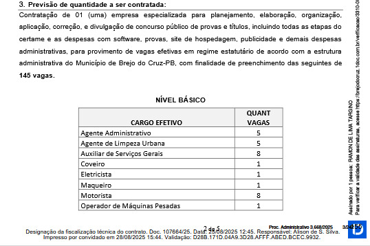 Segundo o edital da contratação, que consta no sistema Tramita do Tribunal de Contas do Estado (TCE-PB), a exigência do nível de escolaridade, por vaga, é a seguinte: