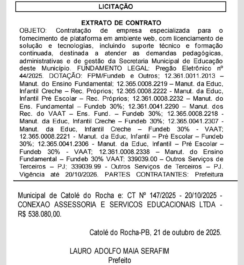 Contratada por R$ R$ 538 mil (Mais de Meio Milhão de reais), para fornecer através de plataforma em ambiente web, sendo especializada em solução e tecnologias, suporte técnico e formação continuada destinada a atender as demandas pedagógicas da Secretaria Municipal de Educação, a Prefeitura de Catolé do Rocha contratou a empresa Conexão Assessoria e Serviços Educacionais LTDA.