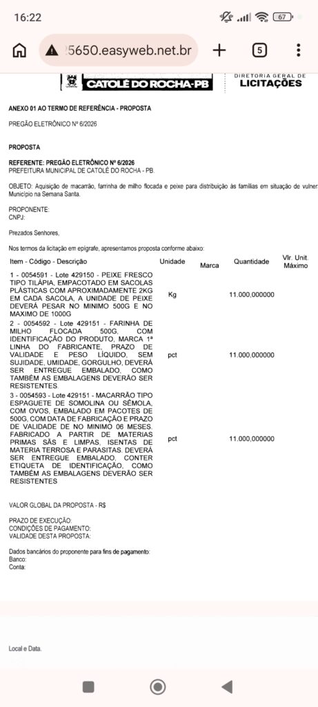A prefeitura de Catolé do Rocha, publicou um edital de licitação e pretende adquirir 11 mil quilos de peixe tilápia, além de 11 mil pacotes de macarrão e flocão para distribuição do jejum às famílias no período da Semana Santa.