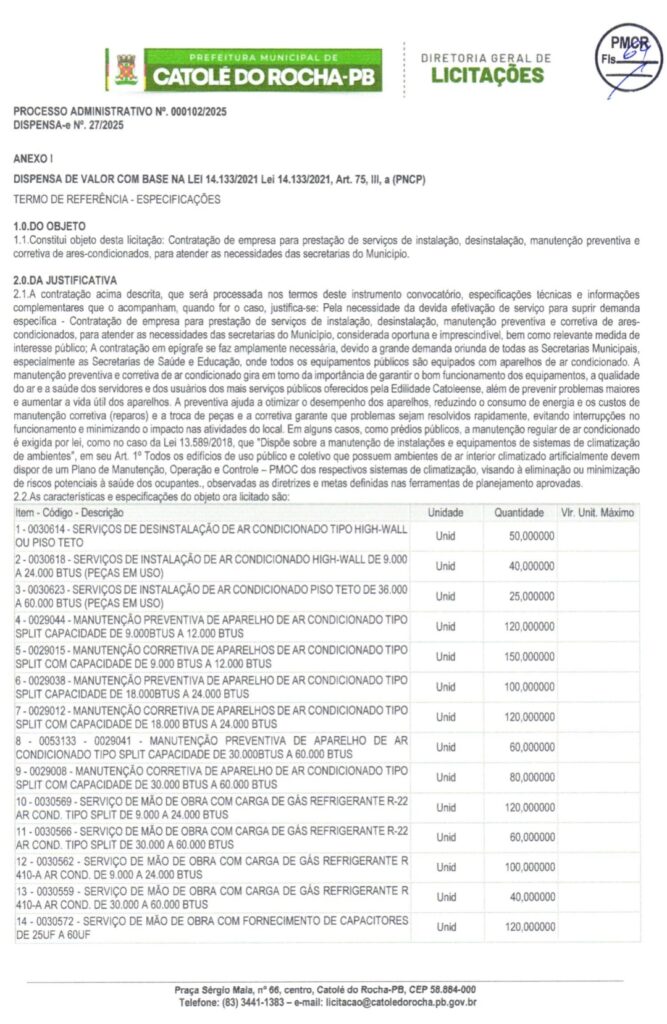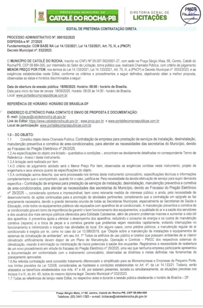 A Prefeitura de Catolé do Rocha prevê gastar R$ 563 mil reais na contratação de empresa para prestação de serviços de instalação, desinstalação, manutenção preventiva e corretiva de ares-condicionados para atender as necessidades das secretarias do município.
