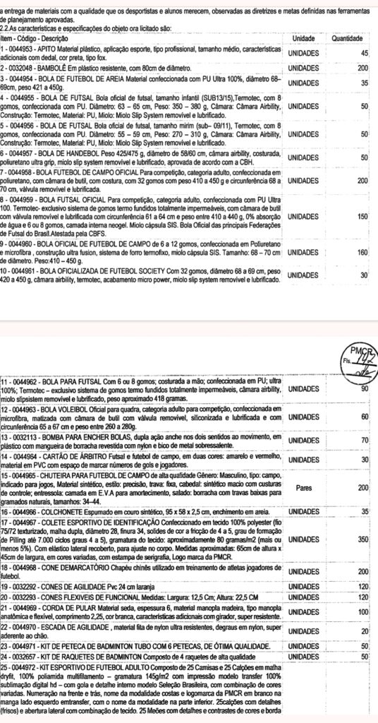 De acordo com os documentos oficiais, o executivo pretende desembolsar R$ 628 mil reais com compras que vão desde bambolês, bolas de futsal e campo, chuteiras, coletes, cones, corda de pular, bomba para encher bolas, dentre outros itens.