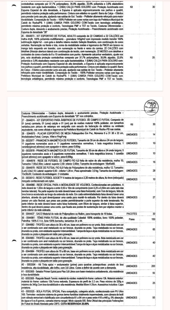 Prefeitura de Catolé do Rocha prevê gastos de mais de Meio milhão na compra de material esportivo