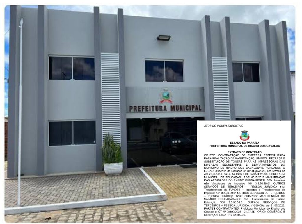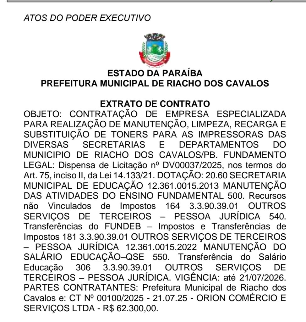 A Prefeitura de Riacho dos Cavalos publicou o extrato de contrato referente a contratação de uma empresa para realizar manutenção, limpeza, e recarga de toners para impressoras de diversas Secretarias do município.