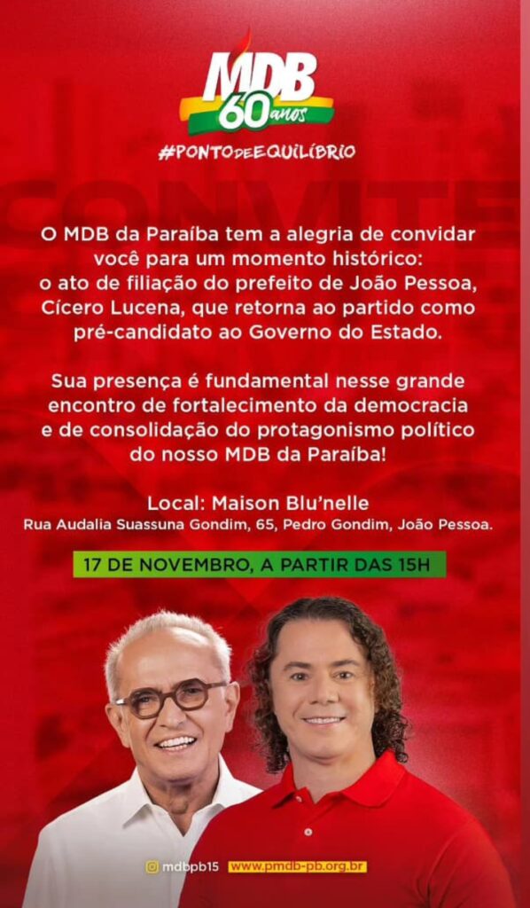 “Dá mais tempo para que nós organizemos, para que nós convidemos os nossos companheiros, sejam estes emedebistas ou não, a participarem dessa data que será festiva. Historicamente é o retorno de Cícero ao MDB. Então vai ser dia 17, a partir das 15 horas, na Blu’nelle, em João Pessoa”, firmou.