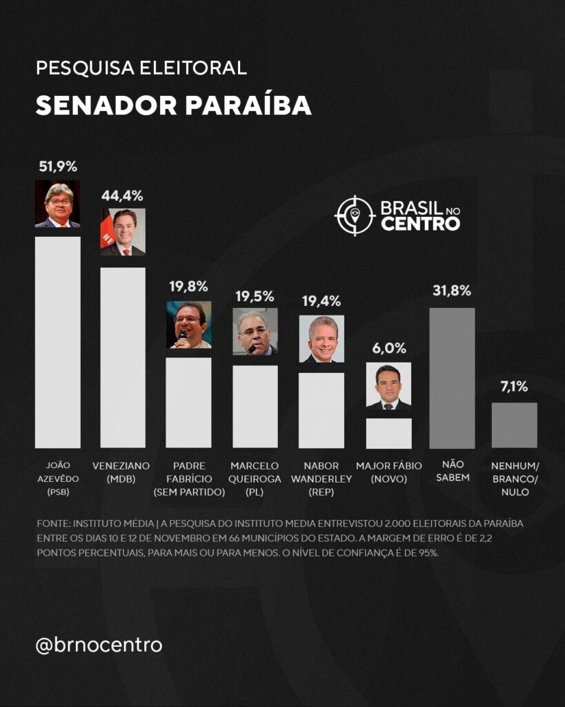 Na soma dos dois votos que cada eleitor possui para o Senado, João Azevêdo aparece com 51,9% das citações, enquanto Veneziano soma 44,4%. Em seguida, surgem Padre Fabrício (19,8%), Marcelo Queiroga (19,5%) e Nabor Wanderley (19,4%), todos com desempenho semelhante. Major Fábio registra 6% das intenções.